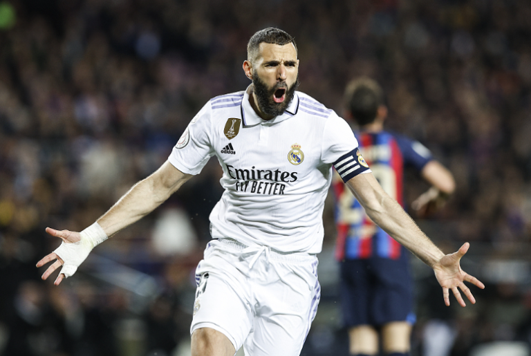 皇家马德里的卡里姆本泽马在国王杯半决赛第二回合在诺坎普对阵巴塞罗那的比赛中进球后庆祝。