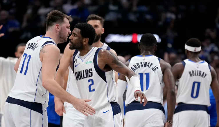 达拉斯小牛队的凯里欧文在对阵洛杉矶湖人队的比赛中打进一球。