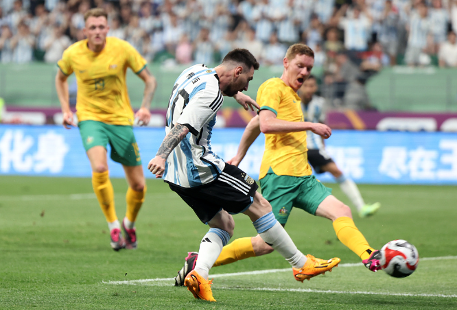 阿根廷队的莱昂内尔·梅西在与澳大利亚队的友谊赛中攻入一球。
