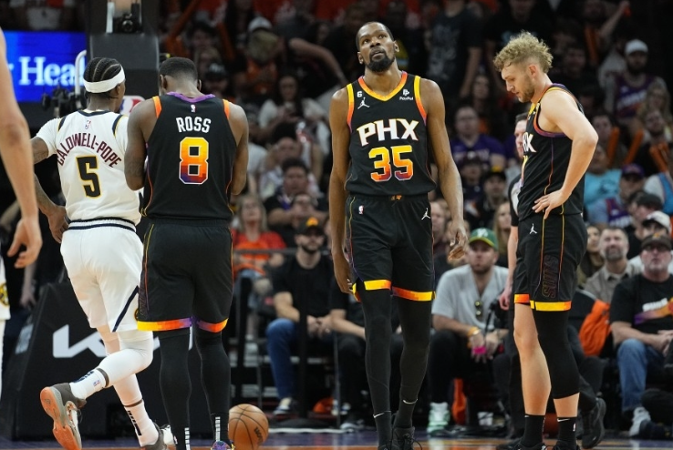 菲尼克斯太阳队的凯文杜兰特在 NBA 西部半决赛对阵丹佛掘金队的第六场比赛中接球。